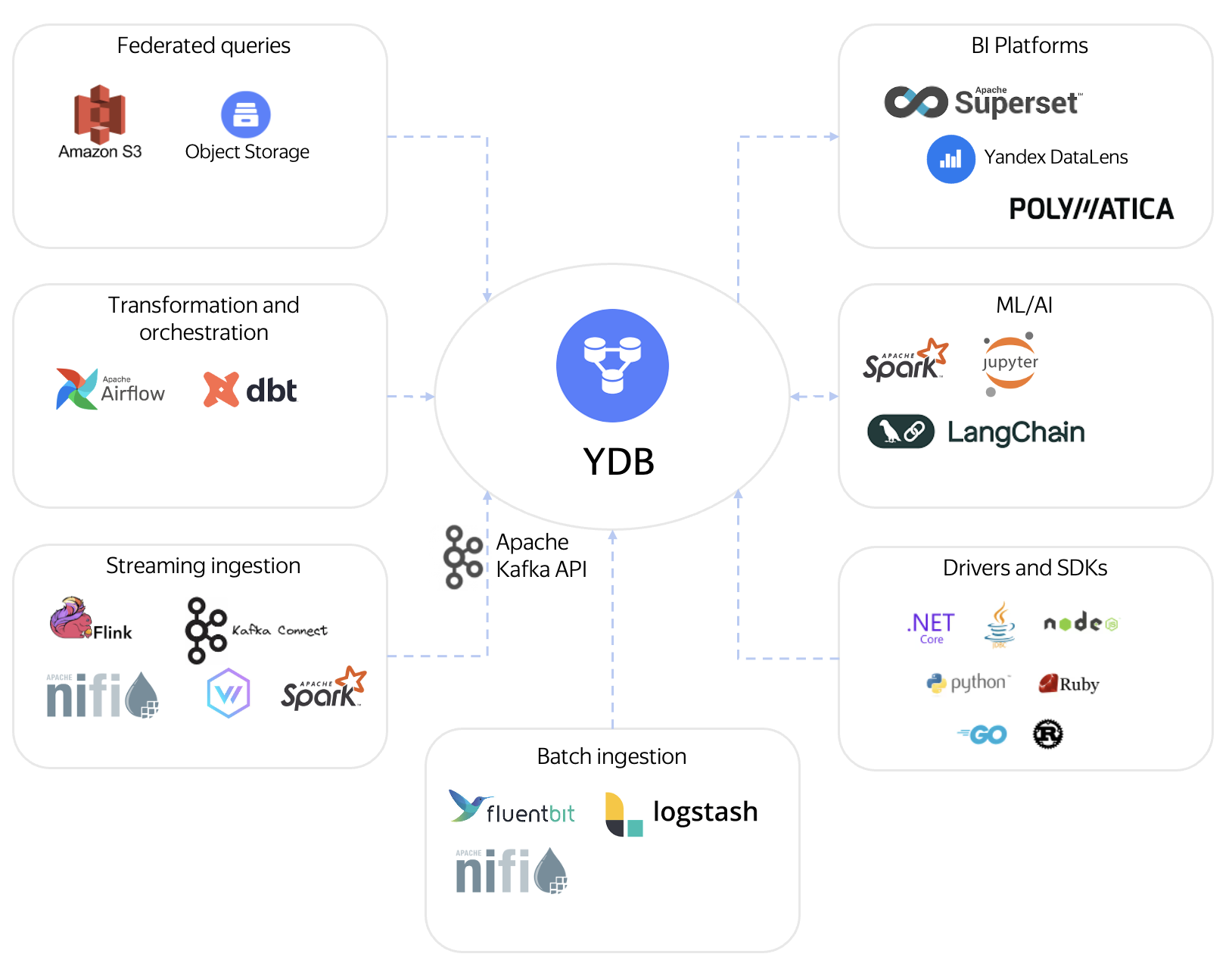 Using YDB allows you to consolidate the functionality of several technologies (for example, separate systems for streaming, storage, and analytics) into a single solution. You can use familiar tools and approaches while gaining the benefits of a distributed system.