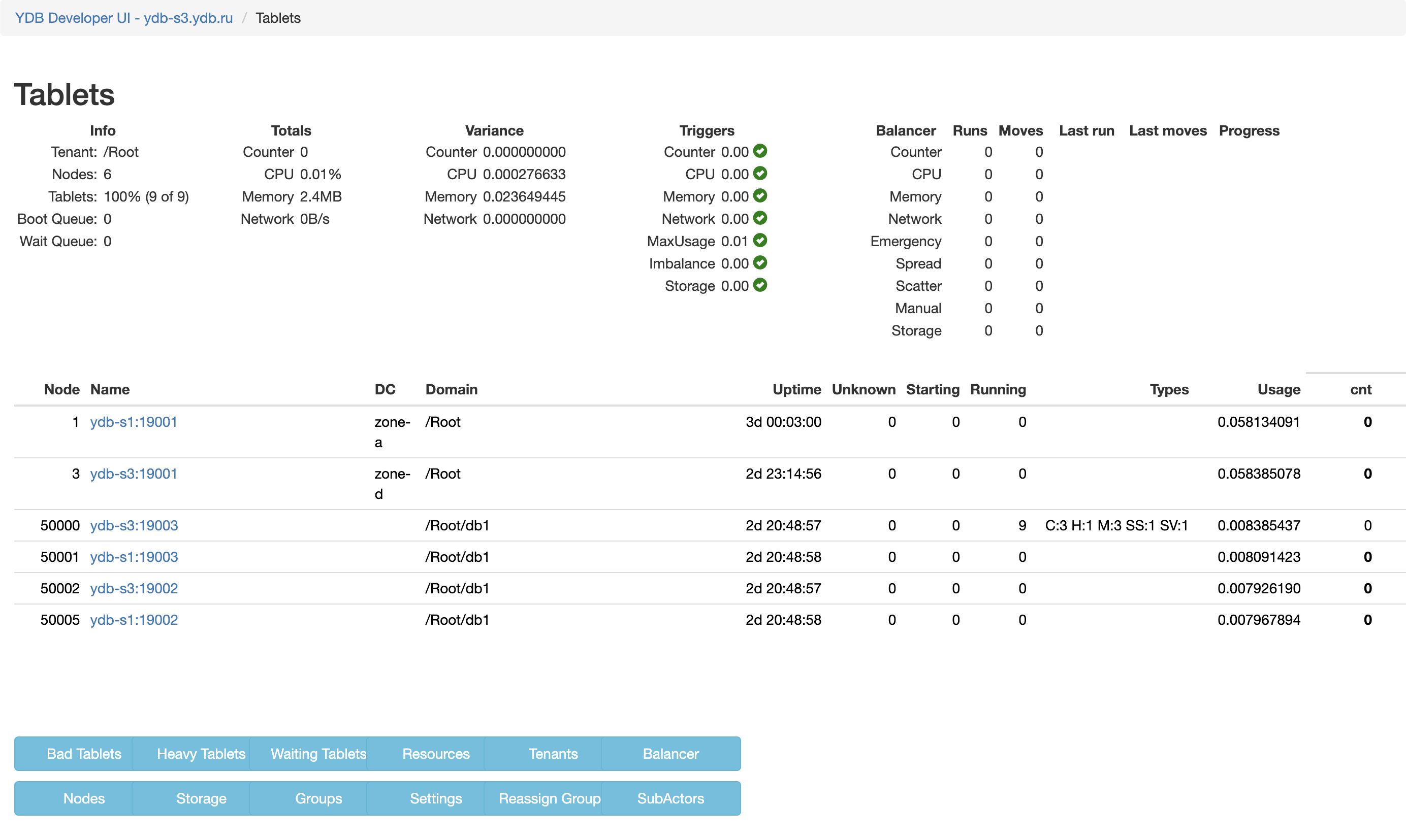YDB uses the Scatter metric to evaluate the balance of hardware resource usage. For more details on the Scatter metric's calculation logic and balancing triggers, see the Resource Usage Imbalance section.
