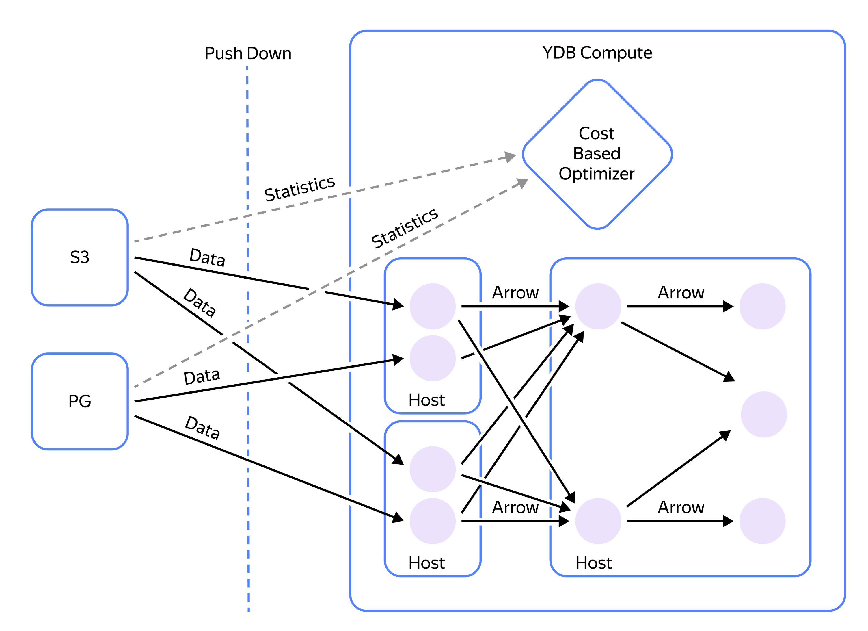 - Оптимизация чтения: YDB использует механизмы оптимизации чтения данных из S3 (partition pruning) для Hive-размещения данных и для более сложных алгоритмов размещения.