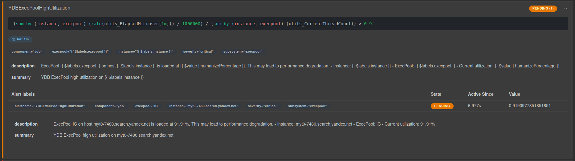 summary: "YDB ExecPool high utilization on {{ $labels.instance }}"