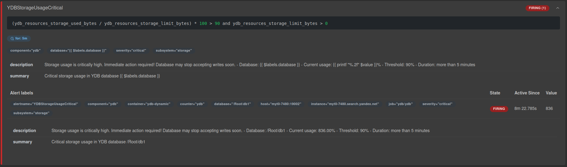 summary: "Critical storage usage in YDB database {{ $labels.database }}"