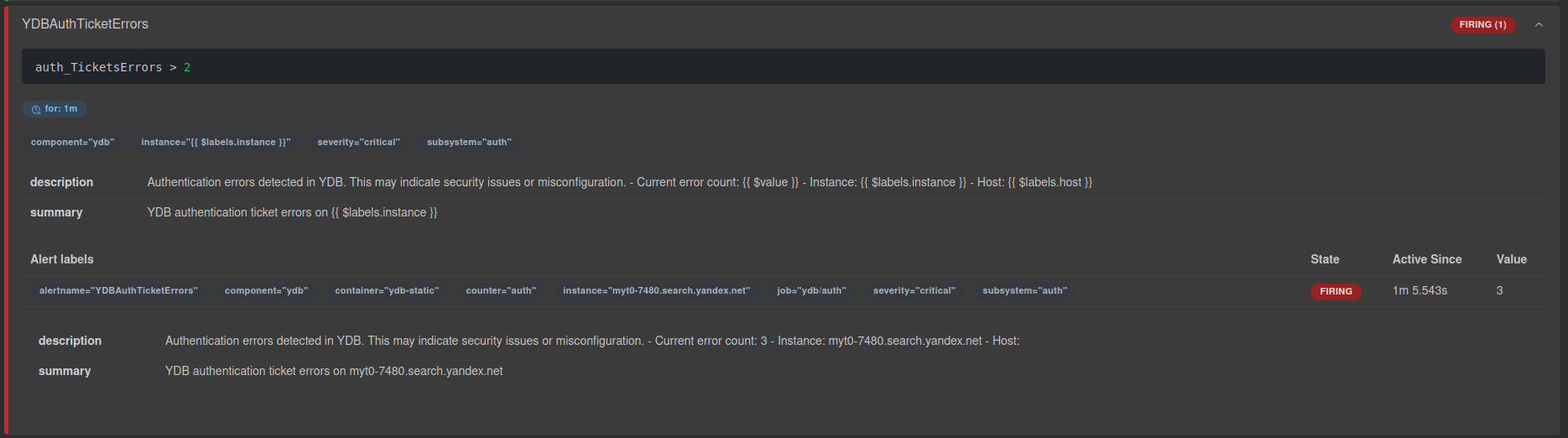 Описание: Правило отслеживает ошибки аутентификации в YDB. Срабатывает при появлении более 2 ошибок за период for. Это может означать, что кто-то неправильно вводит пароль, есть проблемы с настройками безопасности или что-то не так с конфигурацией системы.