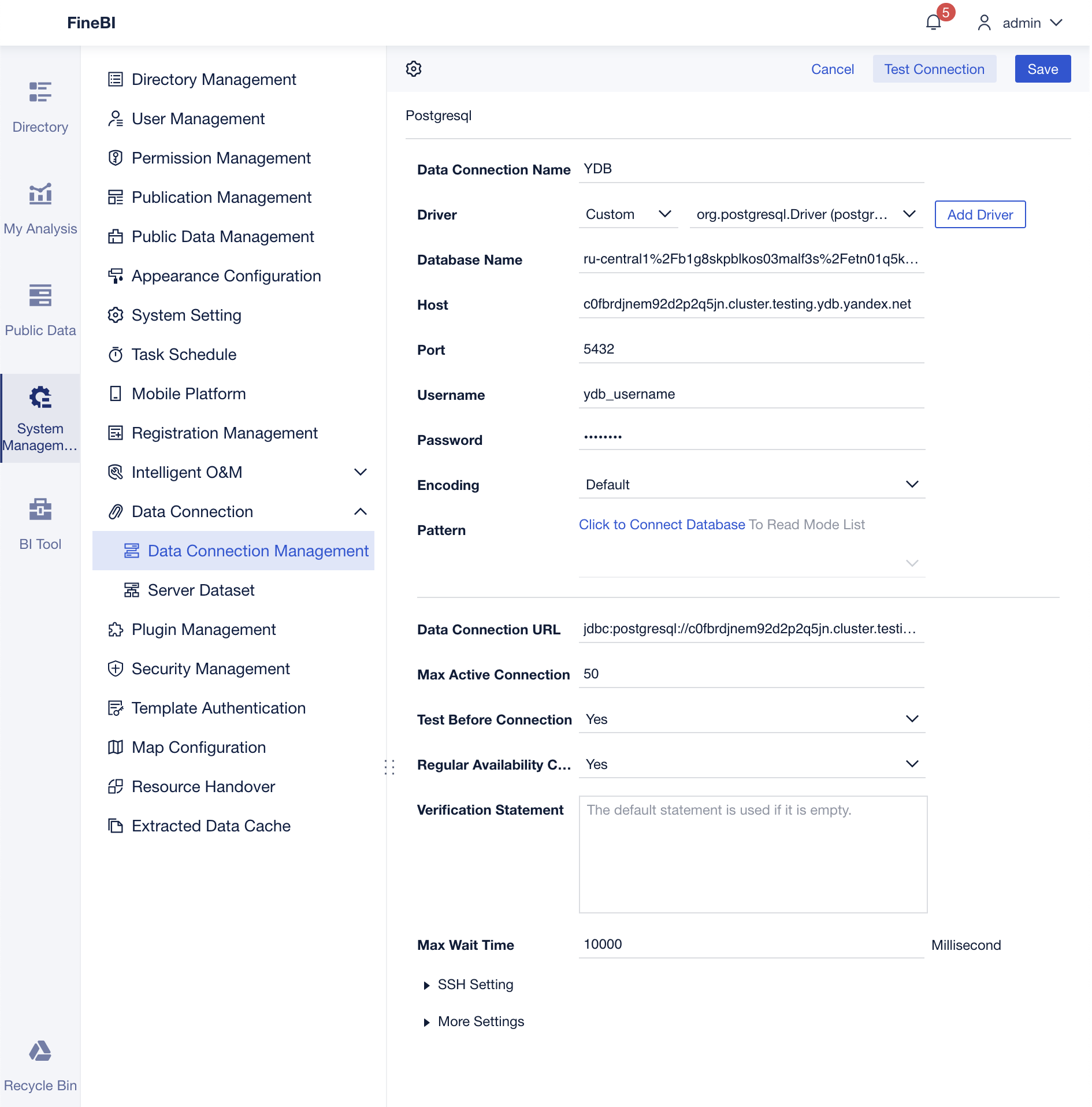 Data Connection Name — наименование соединения с YDB в FineBI.
